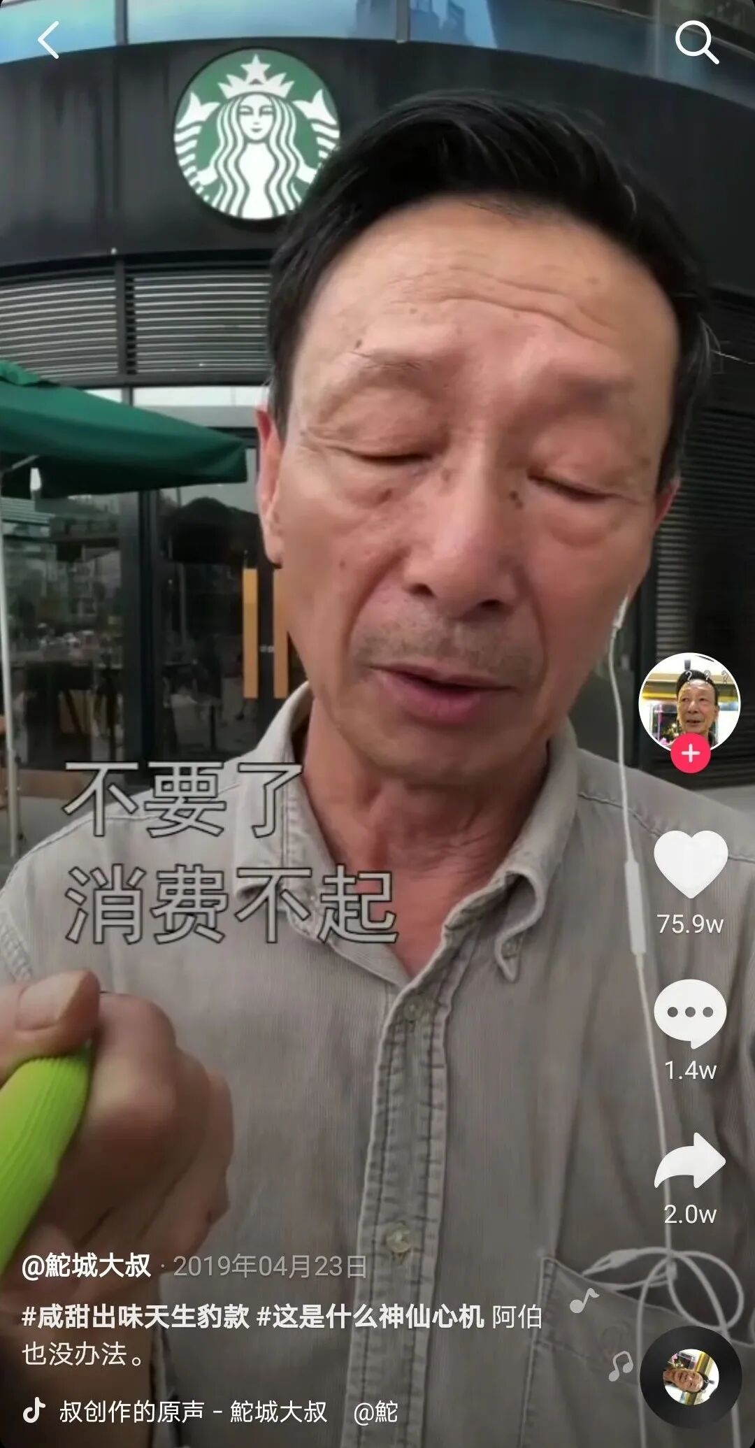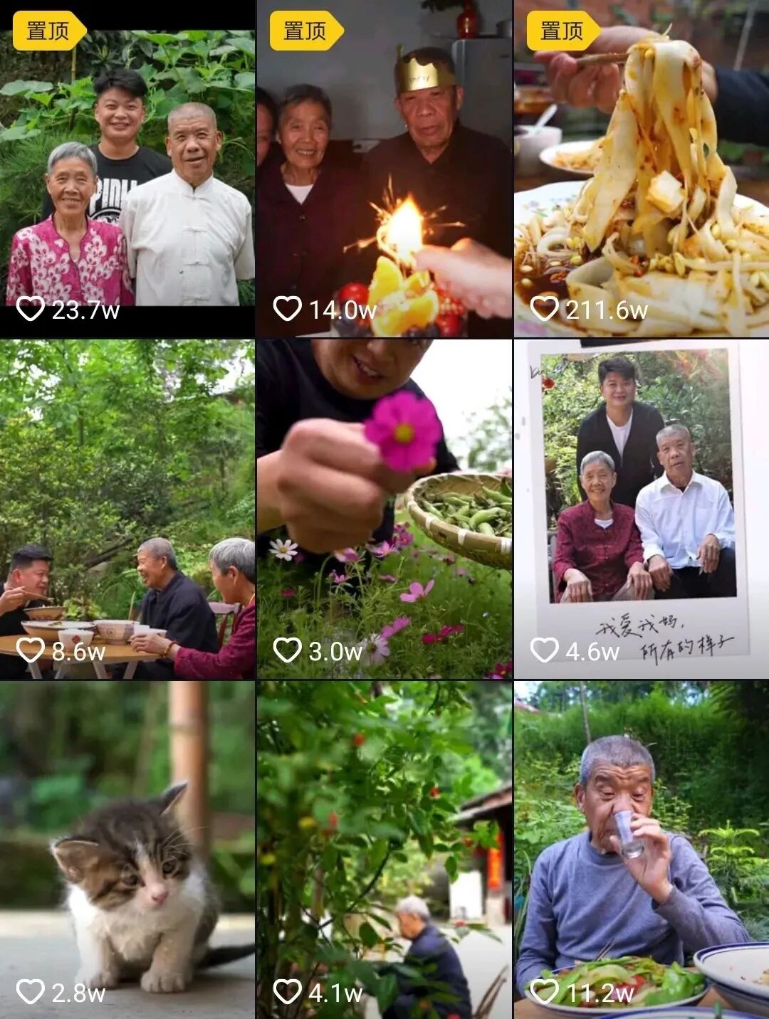 那段把假牙吃掉了的视频,来源:抖音账号蔡昀恩 来自广东汕头的鮀城大叔,要吃年轻人喜欢吃的100种东西。目前他已经打卡了珍珠奶茶、烤肉、寿司、炒酸奶、榴莲饼、酸菜鱼、小龙虾等美食。但在去星巴克时候,大叔只是进店看了价格并没有消费,直言消费不起。消费观念的碰撞,使得这条视频的点赞量高达75.9w。 ![]() 被星巴克劝退的大叔 还有主打陕南地区乡村家常美食,专门拍摄奶奶每天做饭过程的“秦巴忆味”。爷爷奶奶和孙子住在大巴山附近的山村里,跟李子柒一样,他们家也有漂亮的小院子,视频中满目都是郁郁葱葱,吸引了270w粉丝每日围观。 ![]() 秦巴忆味的视频总是绿意盎然,充满人情味