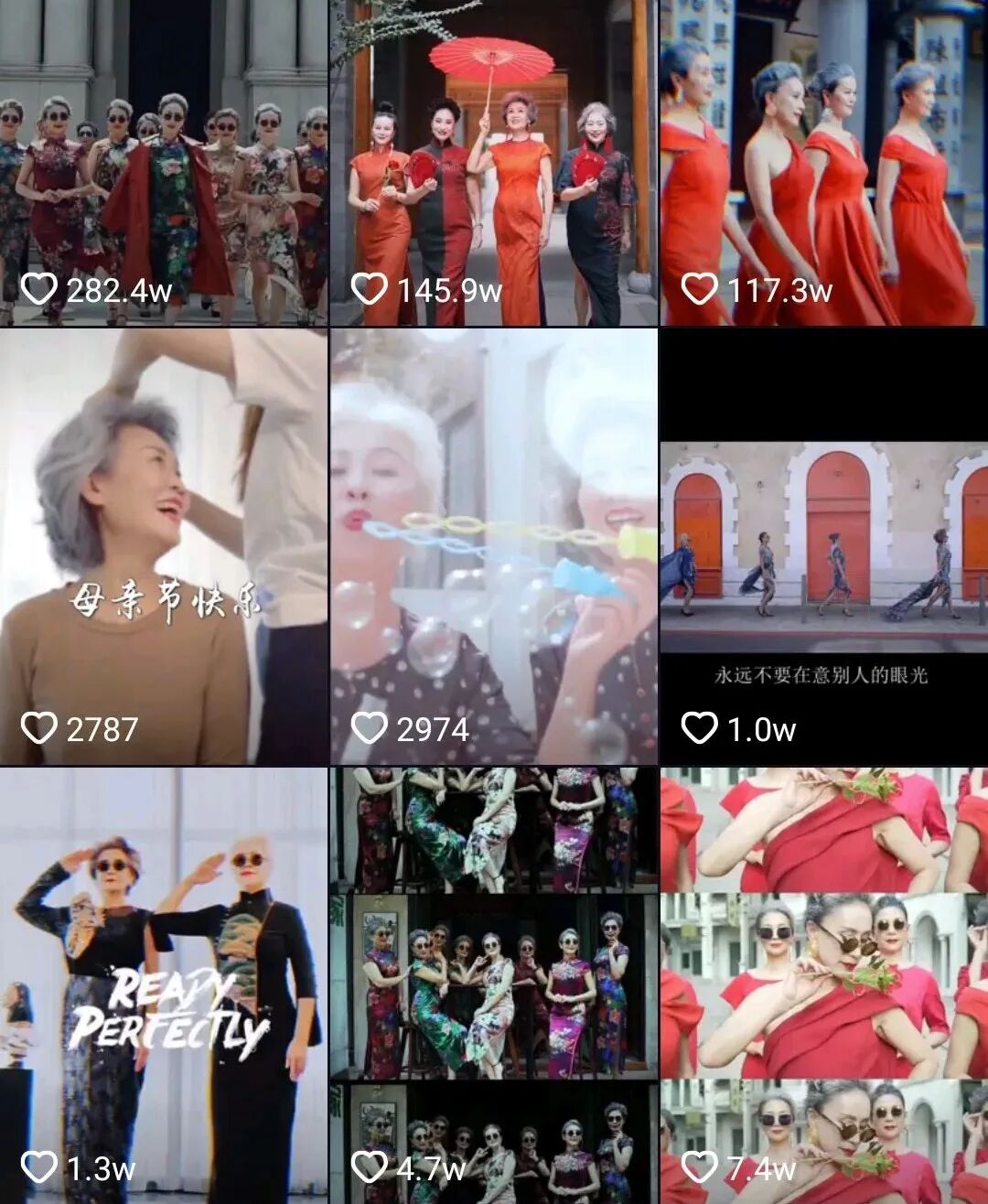 只穿高跟鞋的汪奶奶就是一位精致girl。在视频中,汪奶奶总是妆容精致、服装考究,体态优雅。虽然脸上可见岁月的痕迹,但任谁看了,都不敢相信,汪奶奶其实已经79岁高龄。 ![]() 汪奶奶的抖音主页 2019年8月3日,时尚奶奶团在抖音的**支视频,就收获了7.8w点赞,甚至火出了国。在视频中,她们身穿最能展示东方美的旗袍,婀娜优雅地走在巴黎街头,在网红店打卡,和外国小哥合影,用手机付款…… ![]() 最潮的奶奶团
