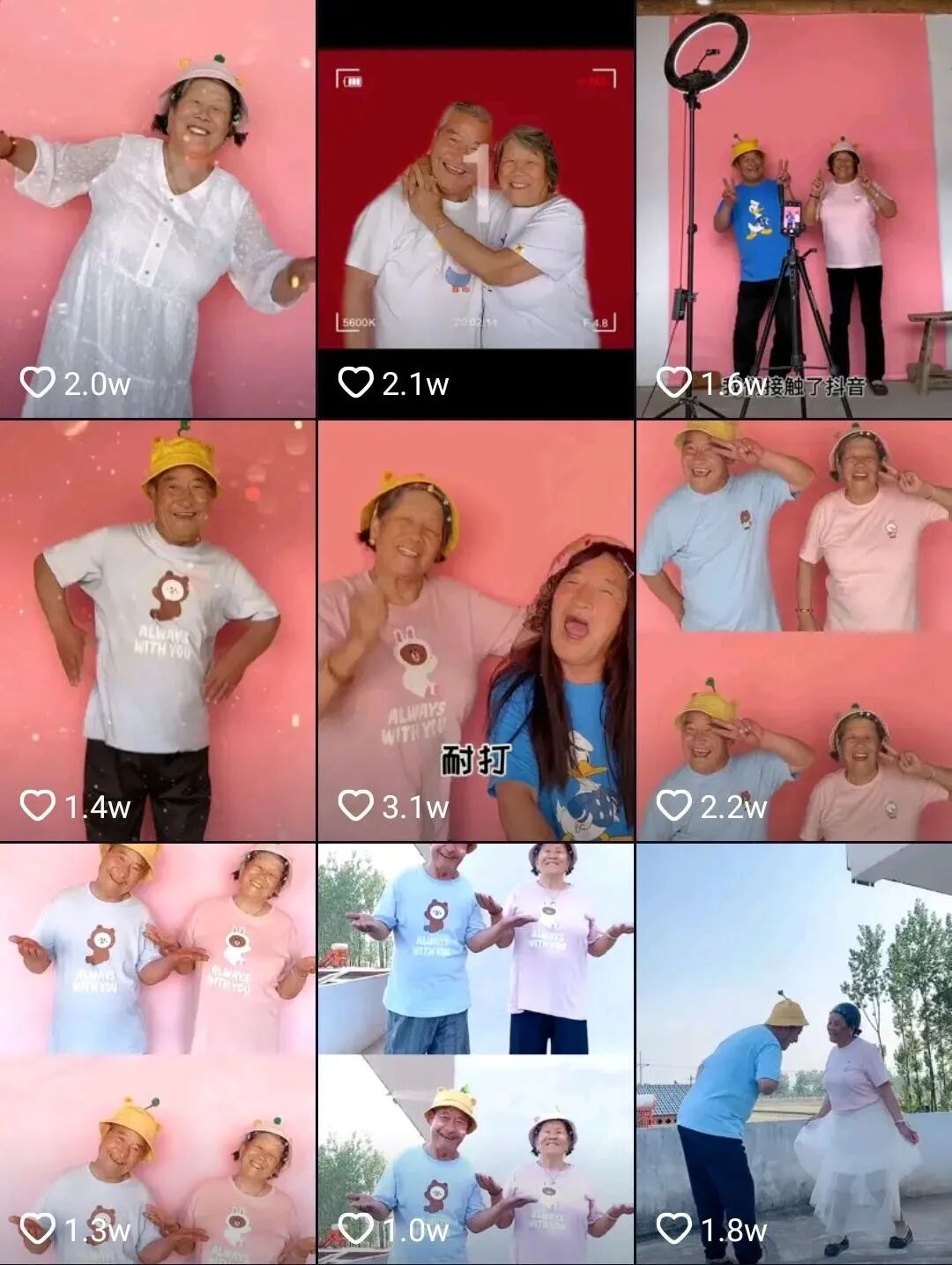 还有粉丝642w的小顽童爷爷和小顽童奶奶,总是带着淳朴的笑容,很多年轻人的段子和梗,在他们的演绎下,淳朴可爱,别有一种风味。 ![]() 酷爱粉色系的爷爷奶奶