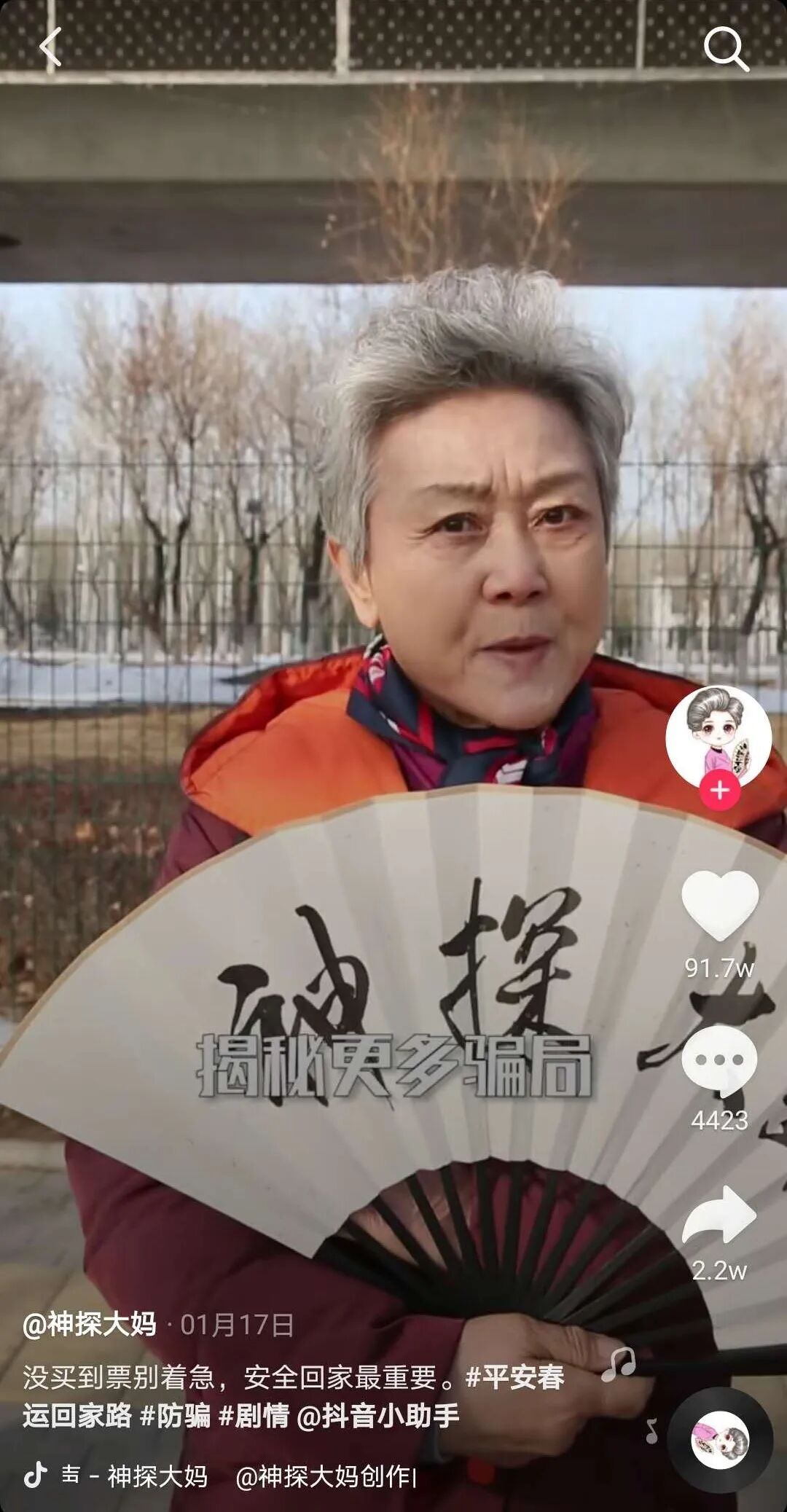 除了金句,还有一种分享过来人经验的短视频,更加偏向于实干。比如,揭露各种针对老年人骗局的神探大妈。一把折扇,一双慧眼,这位退休大妈已经拍摄了上百条骗局揭秘视频,获得点赞近3500万次,粉丝670w。 ![]() 神探大妈致力于揭秘更多骗局