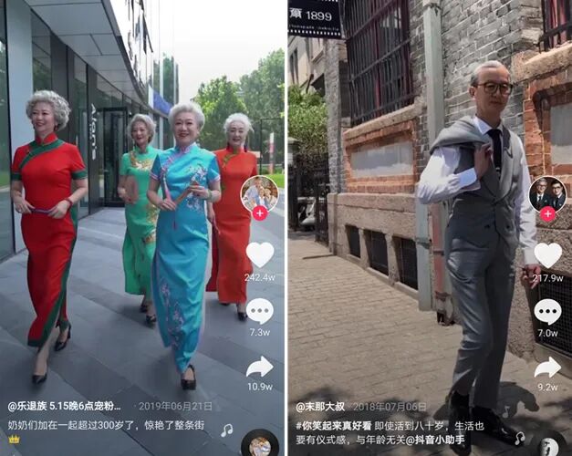 网友纷纷表示,自己老了也要活成奶奶们的样子。外国网友也由衷赞叹: 奶奶们用实际行动告诉我们,衰老并不可怕。 除了时尚奶奶团,由一队爱时尚爱生活的银发爷爷奶奶们组成的“乐退族”,在抖音的粉丝也达到了376.5w。最有绅士风范的“北海爷爷”,年近74岁,生活依然充满仪式感和品质感,他和末那大叔的父子档账号已经在抖音圈粉1421w。 ![]() 左:乐退族 右:末那大叔(北海爷爷)